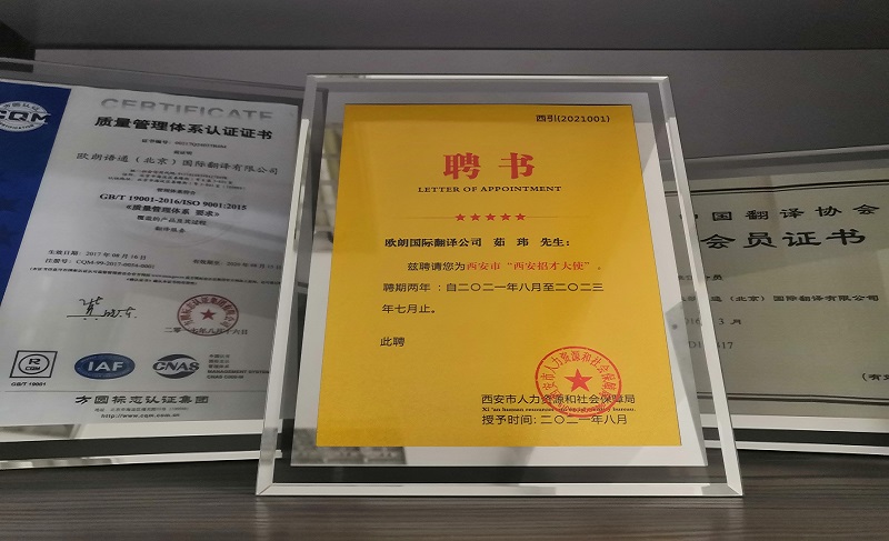 2021年8月19日,由西安市委組織部、西安市人力資源和社會(huì)保障局主辦,西安市人才服務(wù)中心承辦的第五屆西安留學(xué)回國(guó)人才招聘節(jié)在線啟動(dòng),我司代表被聘為“西安招才大使”。歐朗國(guó)際翻譯作為全國(guó)連鎖翻譯企業(yè),擁有15年以上翻譯服務(wù)經(jīng)驗(yàn),一直致力于培養(yǎng)高素質(zhì)的翻譯技能人才,希望歸國(guó)的優(yōu)秀人才能被吸納進(jìn)來。歐朗國(guó)際翻譯,溝通世界,連接你我!